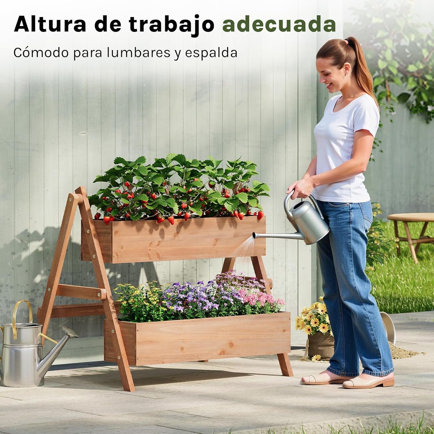 El huerto urbano vertical de WOLTU está diseñado para quienes quieren cultivar en casa sin necesidad de espacio amplio. Su estructura en dos niveles permite aprovechar balcones, terrazas o pequeños jardines, facilitando el acceso a las plantas y mejorando la organización del cultivo.