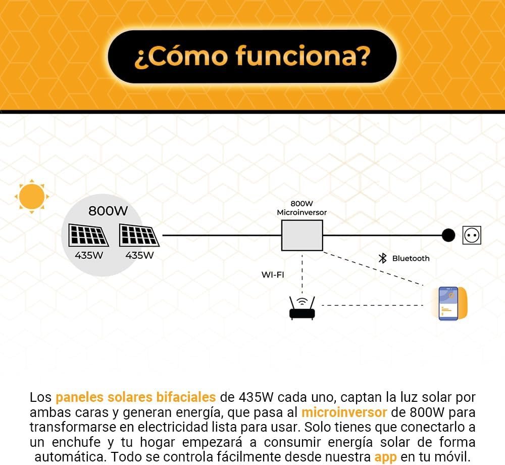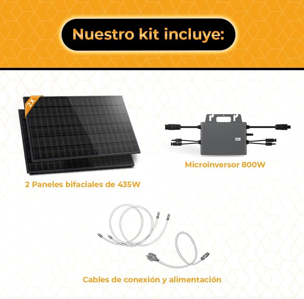 Kit solar plug & play de 800W con paneles bifaciales y microinversor WiFi. Ideal para empezar en el autoconsumo sin instalación y reducir la factura eléctrica desde el primer día.